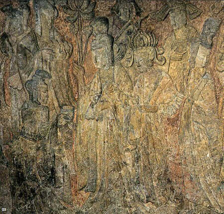 《帝后礼佛图》分别以孝文帝和文昭皇后为中心,形成前簇后拥、南北两相对应的礼佛行进队列。画面构图严谨,错落有致且和谐统一,形象地向我们展示了1500年前,北魏皇室贵族崇尚佛教,列队礼佛的恢宏场面,是北魏社会宗教生活的生动再现,更是佛教造像汉化的代表之作。